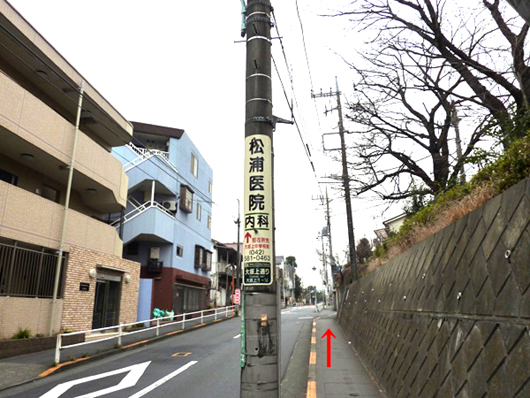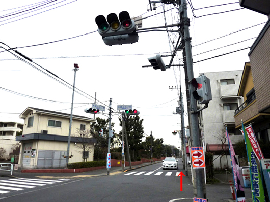 交差点、↑方向に直進(大坂上通り、坂道です)